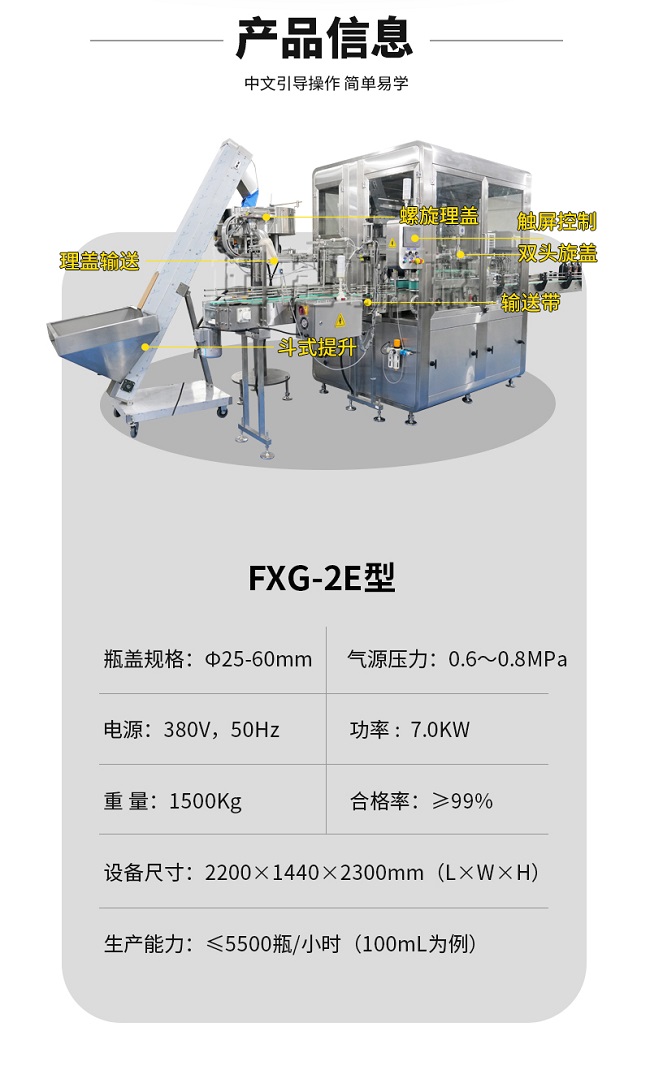 FXG-2E型全自動雙頭跟隨式旋蓋機由理蓋輸蓋機構、抓蓋旋蓋機構、運動模塊、