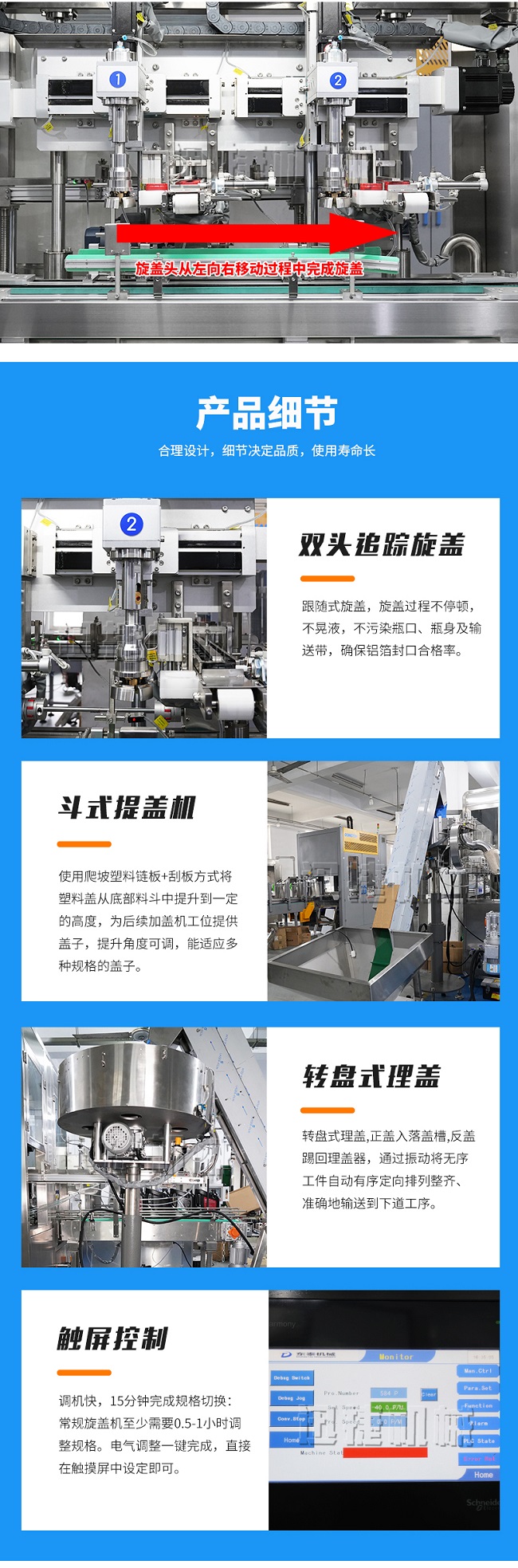 2、品質高:跟隨式旋蓋,旋蓋過程不停頓,不晃液,不污染瓶口、瓶身及輸送帶,確