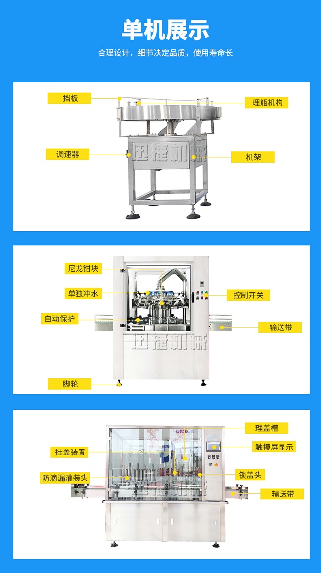 本灌裝流水線設備具有穩定可靠、自動化水平高,相比同類產品有著更長的使用年限,維護簡單,整線中各設備的協調性、連貫性強,整線設計合理等特點。灌裝設備采用系統結構,為當今行業內水平,整線滿足量產化、集成化生產的需要。