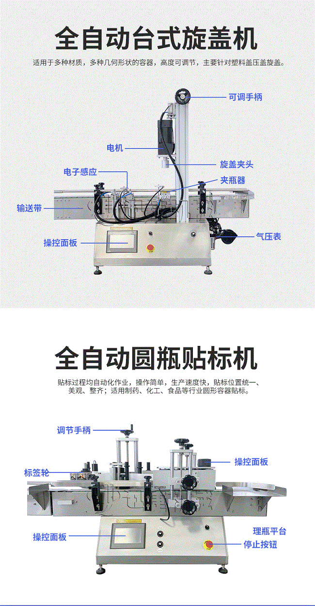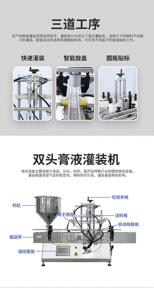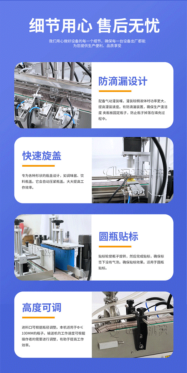 產品說明:生產線根據灌裝范圍選擇型號,灌裝部分為雙頭下潛式灌裝機,適用于不同物料不同瓶子的灌裝,配備自動壓蓋機和圓瓶貼標機,可實現不同蓋子的旋蓋貼標工作。