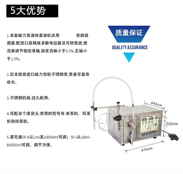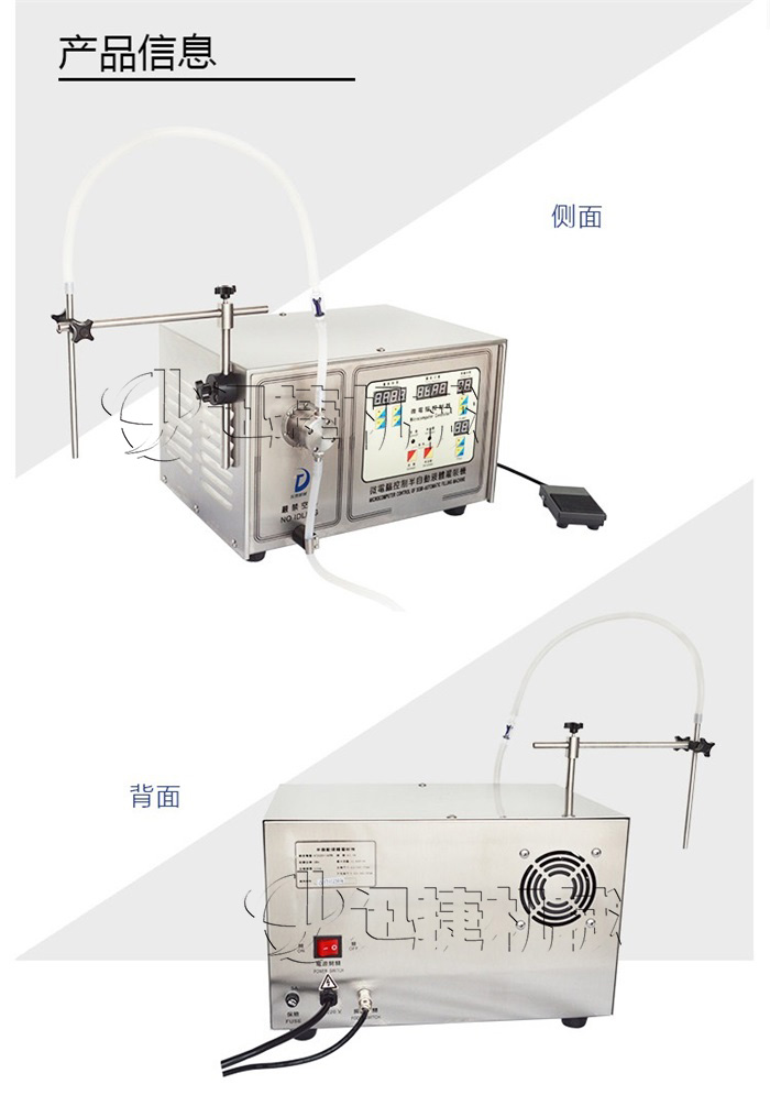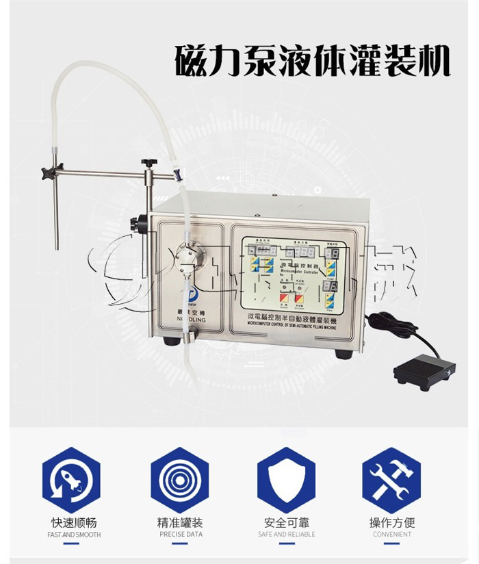 磁力泵小型定量灌 裝機是利用微電腦對微型水泵在灌裝時間、電機轉速等因素上的控制,達到均勻的、重復誤差小的液體灌裝方式,廣泛地應用于藥物、化工、食品、飲料、油脂、 化妝品等行業,磁力泵灌裝機的齒輪泵頭靠磁力驅動,泵輪與電機無軸連接,不用擔心軸封損壞滴漏或泵的負載過高而 燒壞,泵頭為316L不繡鋼制造,耐酸堿,耐腐蝕,適用于幾乎所有能流動的液體均能灌裝,尤其適用于油類,洗滌液,酸堿液,高腐蝕性液體灌裝,性能穩定可靠,使用壽命長。