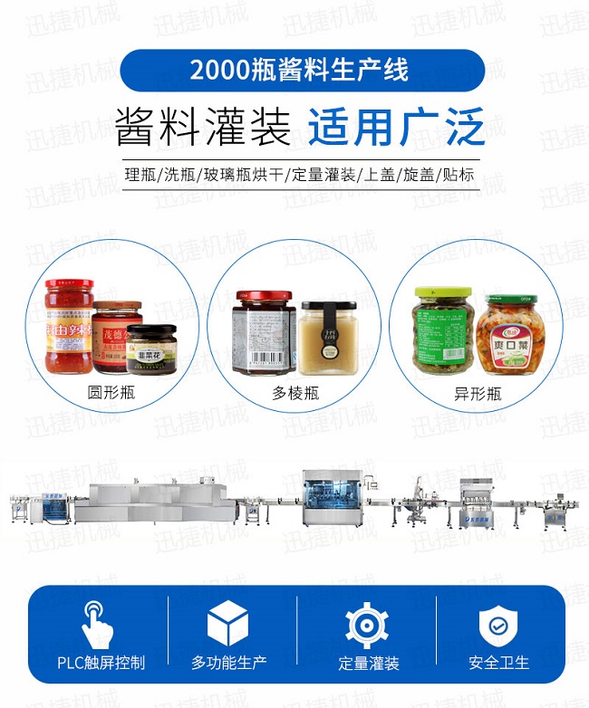 牛肉顆粒醬各種各樣的包裝方式在我們的生活中并不少見,隨著牛肉顆粒醬灌裝豐富化時代的到來,那么針對這么多包裝需求只要選擇這款全自動牛肉顆粒醬灌裝機設備就可以輕松的去實現(xiàn)多樣化的包裝方法,具備無滴漏灌裝;管道采用快裝式鏈接,完全符合衛(wèi)生要求,拆洗維護方便;全自動牛肉顆粒醬灌裝機設備還保障了瓶口干凈衛(wèi)生,輸送帶干凈衛(wèi)生,符合GMP標準有著操作調節(jié)便利,無瓶不灌裝,自動檢測,計數等一些類比較出色的優(yōu)勢特點,迅捷機械可根據客戶需求配理瓶機、旋蓋機,貼標機,打碼機等設備來實現(xiàn)自身企業(yè)的實際生產需求。